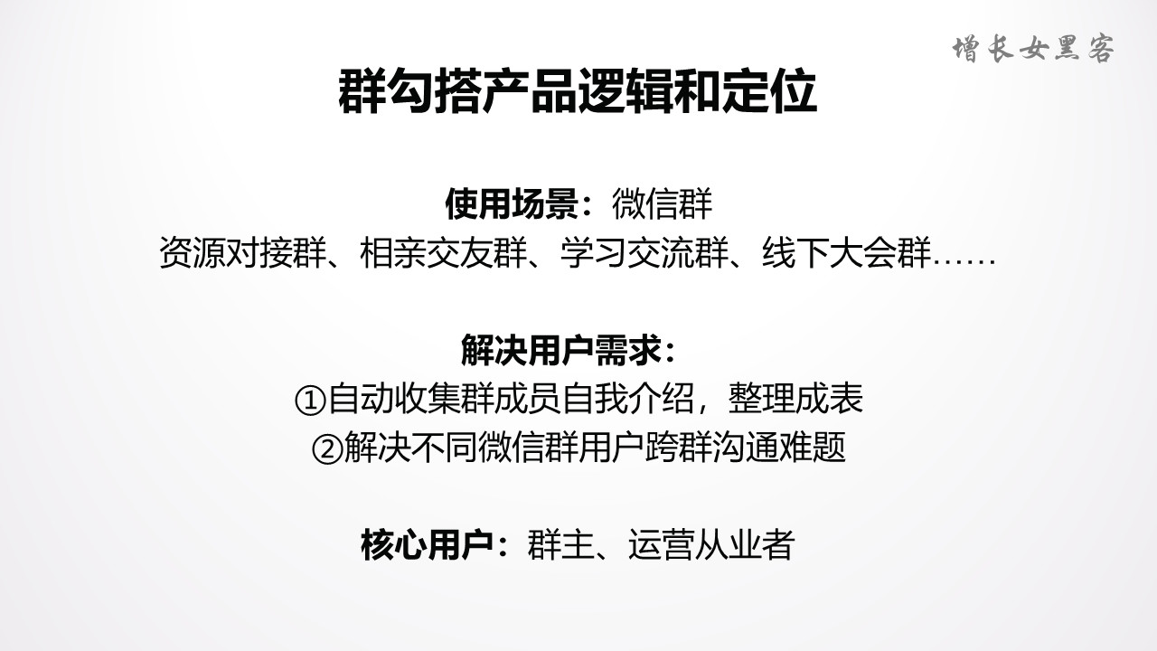 群勾搭的使用者有兩種人,一種是群主,一種是群友。很明顯,群勾搭的核心用戶其實(shí)是群主,如果沒有群主用,群友怎么知道呢?那么,怎么去找到更多的群主使用呢?