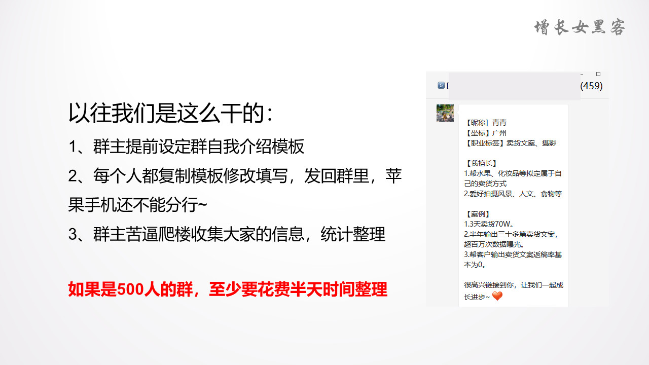 而且我們會發(fā)現(xiàn),如果你社群里用了群勾搭這個(gè)小程序做自我介紹的時(shí)候,它不需要你經(jīng)常去做引導(dǎo)大家要做自我介紹。大家發(fā)了名片出來之后,每一個(gè)發(fā)出來的人會引導(dǎo)下一個(gè)人去填寫,這是我的一個(gè)朋友,在他的學(xué)習(xí)群里用群勾搭小程序后的效果。他說用了群勾搭小程序之后,發(fā)現(xiàn)群內(nèi)的活躍度要比以往的訓(xùn)練營要高,不需要人工去引導(dǎo)自己去做自我介紹了,都是用戶自己去做的。