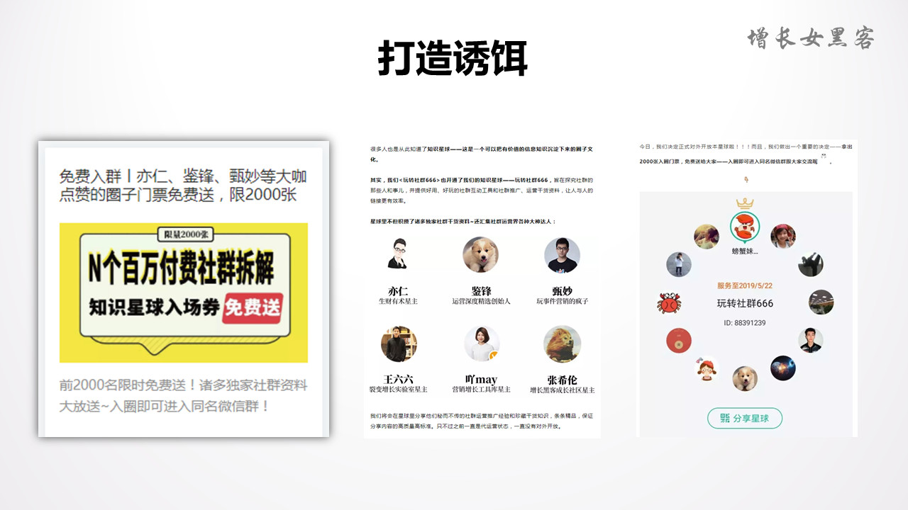 我把整個(gè)過程再給大家拆解一下,首先是打造活動誘餌,在做裂變的過程當(dāng)中打造誘餌是非常非常重要的,能不能讓用戶真的感知到活動價(jià)值,讓用戶一看就覺得這就是我想要的,就愿意加入甚至付費(fèi)加入。