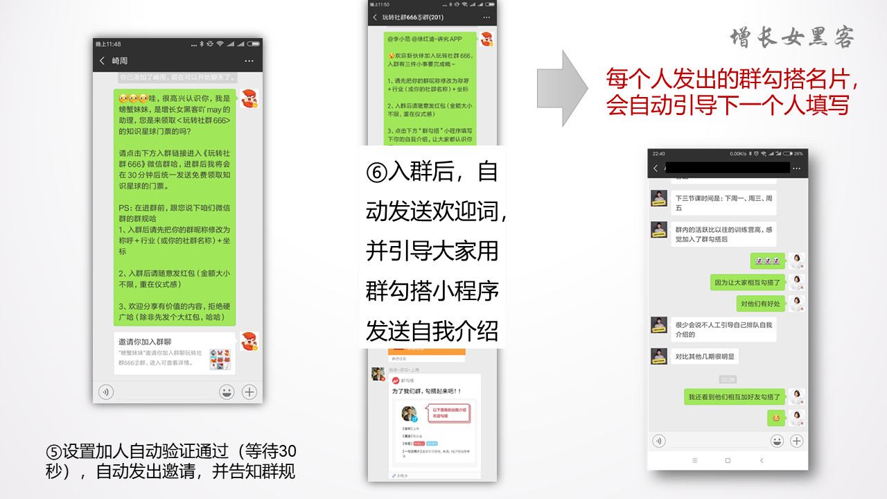 進(jìn)群后我們很自然地就讓大家用群勾搭小程序把自我介紹發(fā)出來,這時(shí)候就成功的就把我們?nèi)汗创钚〕绦蚯哆M(jìn)來了。