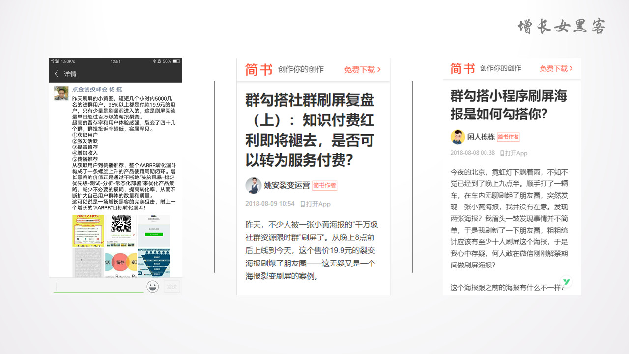 任務(wù)寶的威力的確巨大,增粉很快,為了保證每個(gè)進(jìn)群的朋友切切實(shí)實(shí)能獲得超值的內(nèi)容,并且降低新號被清粉的風(fēng)險(xiǎn),我們有意控制啟動量,讓速度慢下來,最終9天增粉約1萬人,加個(gè)人號2000多,并且都進(jìn)了群,目前有1600多人領(lǐng)取了星球。意外收獲的是,有將近10人付費(fèi)購買了知識星球門票,把我們買書的成本覆蓋了。