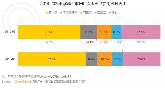 此外,QuestMobile數(shù)據(jù)還指出,相較2018年,2019年騰訊系A(chǔ)pp使用時長占比降幅達3.7%,字節(jié)跳動系占比則增長3.1%,而對比2017年,2018年相應(yīng)數(shù)據(jù)分別是-6.6%、+6.2%。這也就意味著,使用字節(jié)跳動產(chǎn)品的用戶越來越多,并且正在逐漸蠶食原本屬于BAT的部分流量。