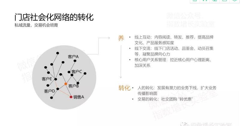 門店店長和員工將會使用傳統(tǒng)的銷售能力(這是線下多年沉淀的銷售能力,可在這套體系中直接復(fù)用),將不是好友的關(guān)鍵用戶想辦法發(fā)展成為一度好友(即加到關(guān)鍵節(jié)點(diǎn)用戶的微信),并且進(jìn)行銷售轉(zhuǎn)化。
