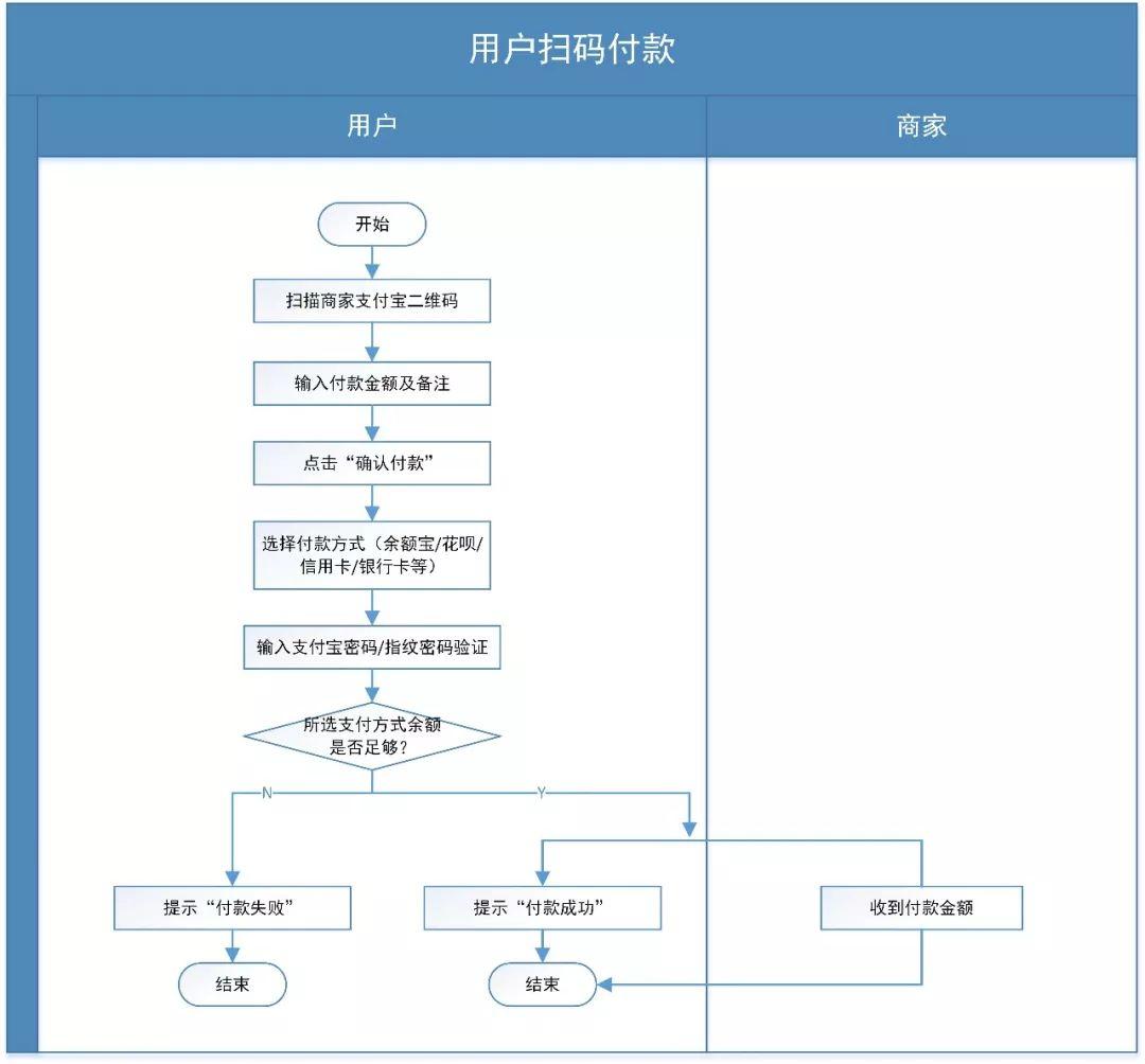 如要實現支付寶掃碼付款的功能,涉及到商家提供商家支付寶二維碼——用戶掃碼識別——輸入付款金額——輸入支付寶付款密碼——確認付款——商家收到轉賬,其中參與的角色有賣家和買家,涉及功能模塊有掃碼識別商家、轉賬、支付、通知等。